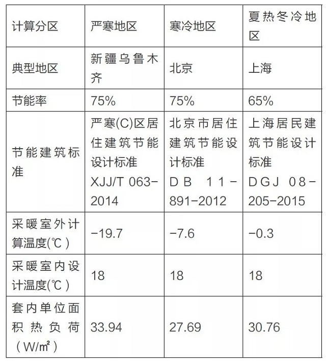 為了有個相對統(tǒng)一的計算標準,本文采用當?shù)噩F(xiàn)行的節(jié)能建筑標準要求的最大傳熱系數(shù)來計算,具體示范地區(qū)選擇“熱工計算分區(qū)”中的三個典型地區(qū)(烏魯木齊、北京、上海)的采用當?shù)噩F(xiàn)行節(jié)能建筑標準的建筑物去計算其采暖季的耗電量。關(guān)于負荷計算的內(nèi)容上篇文章有詳細介紹,這里略過不表,計算后內(nèi)容見表1。