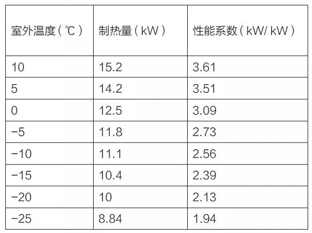 空氣源熱泵機組做采暖的熱源設(shè)備,與采暖系統(tǒng)的耗電量有關(guān)的主要是制熱量和性能系數(shù)兩個參數(shù)。我們以一款5HP低溫變頻機的性能參數(shù)(含水泵)為例來說明,出水溫度按41℃計算,表2是該機器的采暖全工況的性能參數(shù)表。