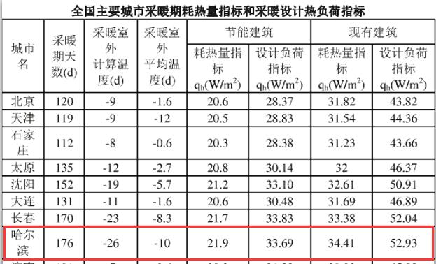 根據(jù)《全國(guó)主要城市采暖期耗熱量指標(biāo)和采暖設(shè)計(jì)熱負(fù)荷指標(biāo)》,哈爾濱節(jié)能建筑每平方米采暖設(shè)計(jì)負(fù)荷指標(biāo)為33.69w/㎡*24h*176d/1000=142.31kwh/㎡