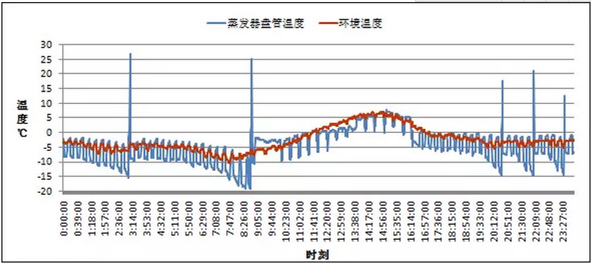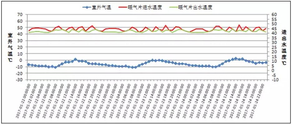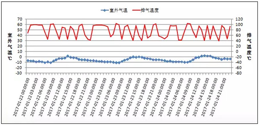 數(shù)據(jù)顯示這三天時(shí)間日平均氣溫-5℃~-6.3℃,最低氣溫-12.2℃,最高氣溫2.9℃,室內(nèi)溫度始終維持在18.5~21.2℃,機(jī)組出水溫度43~48℃,機(jī)組回水溫度41~45℃,出回水溫差基本穩(wěn)定在3℃,壓縮機(jī)運(yùn)行排氣溫度最高103.6℃。