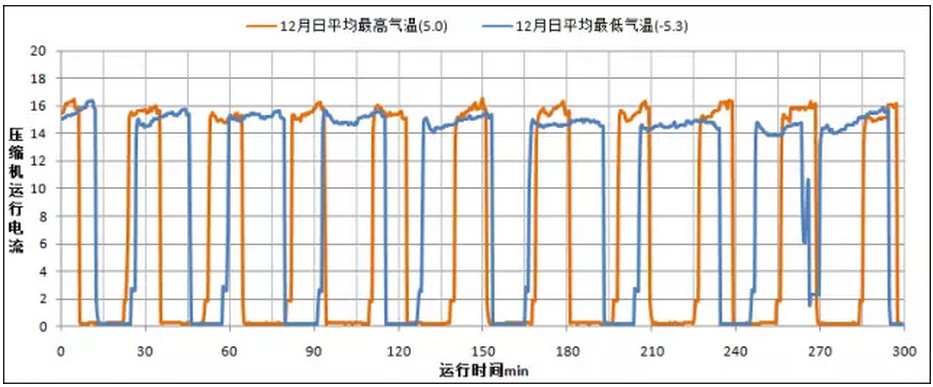 同時(shí)從Fig.9看出氣溫低的階段,機(jī)組的開機(jī)時(shí)間(制熱時(shí)間)增加66.7%,停機(jī)間隔減小,【熱泵市場 水印】總的開停機(jī)循環(huán)時(shí)間基本相同,反映低環(huán)境溫度下機(jī)組制熱時(shí)間,耗費(fèi)電量將會大幅增加。