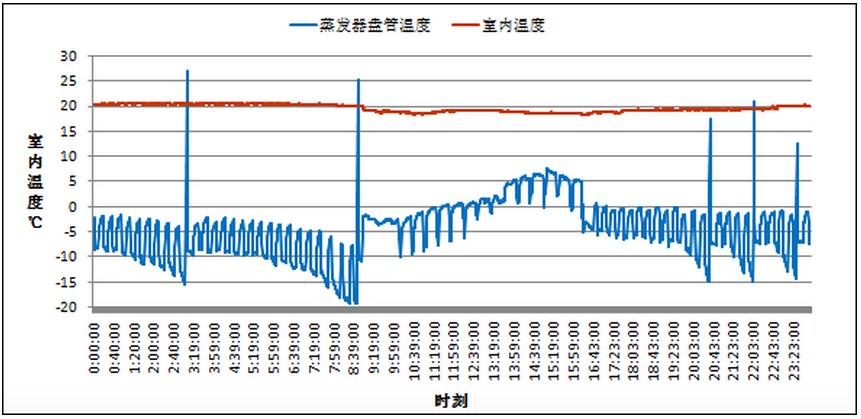 本文選取了2016年12月19日這一天重霧霾天氣,北京市發(fā)布了霧霾橙色預(yù)警并進(jìn)行了交通限行。由于北方冬季氣溫低,霧霾、下雪天氣多,極容易造成空氣源熱泵蒸發(fā)器大面積結(jié)霜,影響制熱效果。從本次監(jiān)測中選取重霧霾天氣,濕度高,同時(shí)氣溫-4℃~8℃也是機(jī)組容易結(jié)霜的階段。