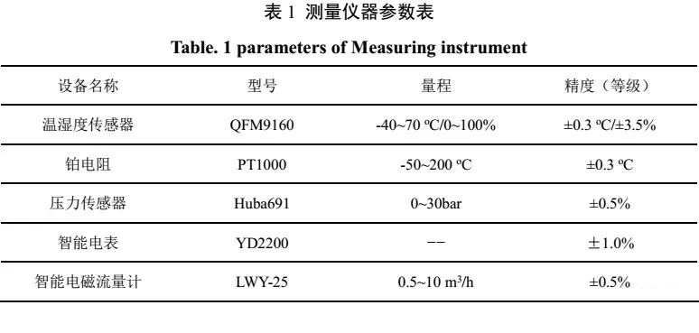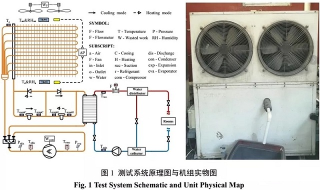 測試系統(tǒng)對空氣源熱泵的空氣側(cè)、制冷劑側(cè)與制取熱水側(cè)的運(yùn)行參數(shù)以及能耗情況進(jìn)行實時監(jiān)測。測試機(jī)組原理圖與實物圖如圖1中所示,在壓縮機(jī)吸/排氣管上分別設(shè)有溫度和壓力傳感器監(jiān)測壓縮機(jī)的吸/排氣溫度和壓力,在水側(cè)利用鉑電阻PT1000測量機(jī)組的進(jìn)/出水溫度,利用電磁流量計測量水流量。其中主要的測量儀器參數(shù)如表1所示。