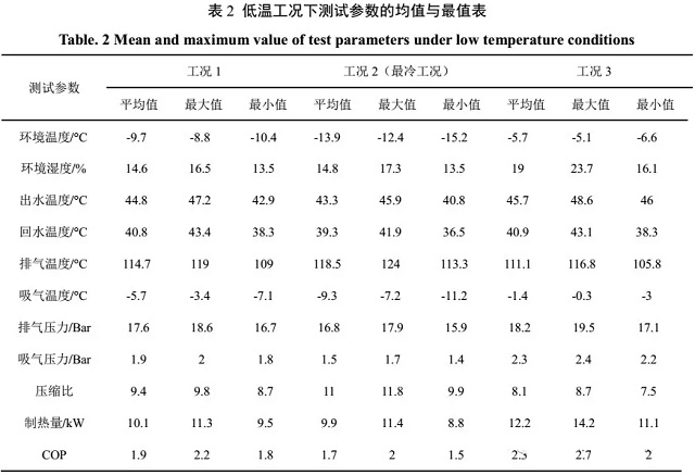 由表2可知,三個工況平均制熱量分別為:工況1為10.1kW,工況2為9.9kW,工況3為12.5kW,相對于額定制熱量19.6kW,機(jī)組制熱量的衰減幅度分別為48.5%、49.5%和36.2%,三個工況整體的平均制熱量10.7kW;經(jīng)統(tǒng)計,三個工況總能耗量為167.4kWh;三個工況平均COP分別為:工況1為1.91,工況2為1.71,工況3為2.25,整體COP均值為1.96。其中,最冷工況下,當(dāng)溫度低至-15.2℃時,制熱量僅為8.8kW,衰減幅度高達(dá)到55%,COP僅為1.49。因此,低溫導(dǎo)致了機(jī)組的制熱量和COP嚴(yán)重衰減。