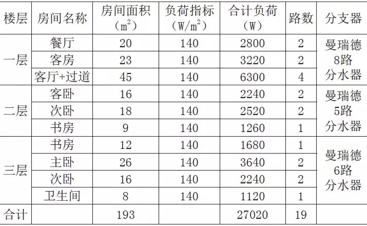 熱負(fù)荷由外圍護(hù)結(jié)構(gòu)和內(nèi)圍護(hù)結(jié)構(gòu)的基本耗熱量及其附加耗熱量和冷空氣滲透耗熱量組成;冬季供暖的室內(nèi)設(shè)計(jì)溫度設(shè)為20℃,經(jīng)負(fù)荷計(jì)算及規(guī)范,參照本地經(jīng)驗(yàn),別墅建筑的供暖熱負(fù)荷設(shè)計(jì)指標(biāo)為140W/m2,符合要求。