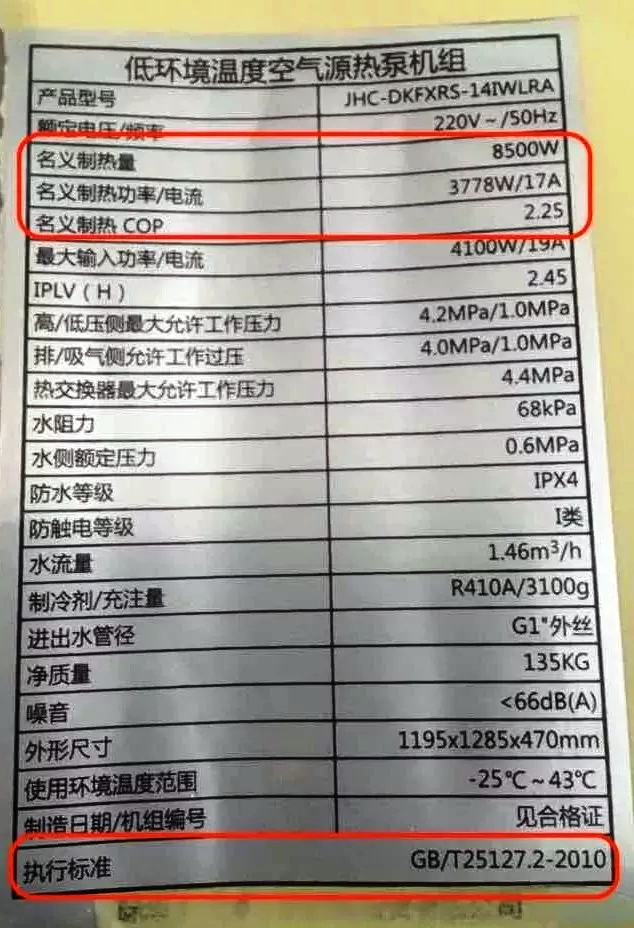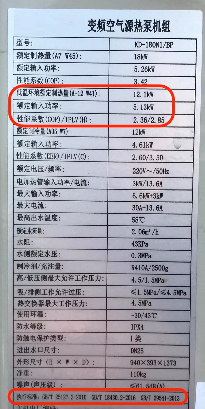 從其銘牌上我們可以看出,該機型執(zhí)行的標(biāo)準(zhǔn)是GB/T 18430.2。該標(biāo)準(zhǔn)適合于風(fēng)冷熱泵,其制熱名義工況是7℃。而根據(jù)北京農(nóng)委的要求,低溫空氣源熱泵的送檢要求為:
