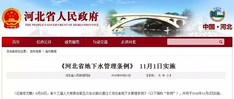 9月20日,《河北省地下水管理?xiàng)l例》在河北省第十三屆人民代表大會(huì)常務(wù)委員會(huì)第五次會(huì)議上獲高票通過,將于2018年11月1日實(shí)施!稐l例》規(guī)定: