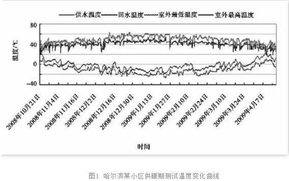 然而,通過對供暖系統(tǒng)的實(shí)際運(yùn)行調(diào)查,目前北方地區(qū)大多數(shù)城市集中供熱系統(tǒng)運(yùn)行參數(shù),就是在最冷月運(yùn)行參數(shù)也遠(yuǎn)遠(yuǎn)小于設(shè)計(jì)工況。對北方幾十個城市調(diào)查結(jié)果是:二次網(wǎng)供水溫度約在47℃~63℃,回水溫度約在40℃~50℃,運(yùn)行溫差約為7.8℃~14.7℃,溫差均小于設(shè)計(jì)溫差20℃。圖1是哈爾濱某小區(qū)測試整個供暖季溫度變化曲線,供暖初期供熱溫度低于40℃,最冷天氣供熱溫度為60℃。