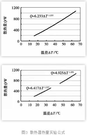 風(fēng)機(jī)盤管冷暖兩用,供水溫度可降低,用于住宅供暖時宜立式安裝,宜靠外窗設(shè)置。散熱器用于空氣源熱泵供暖系統(tǒng),熱媒溫度可降低與熱水供應(yīng)溫度55℃一致。其散熱量計(jì)算完全可按各類散熱器給出的實(shí)驗(yàn)公式,代入ΔT℃進(jìn)行計(jì)算即可。圖3是對同一組散熱器分別對溫差ΔT=15℃~65℃進(jìn)行分段實(shí)驗(yàn)和連續(xù)實(shí)驗(yàn)的結(jié)果,低溫工況的散熱量可視為ΔT=40℃~65℃試驗(yàn)曲線的延長線。