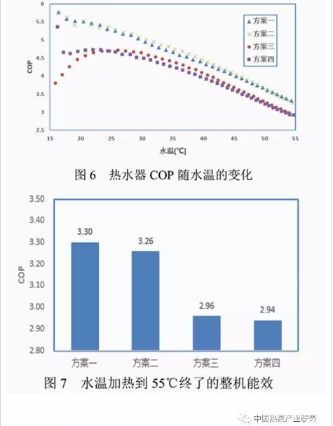 圖6和圖7分別為四組不同方案,總COP隨水溫的變化情況以及水溫從15℃加熱到55℃的整機(jī)能效數(shù)值。從圖中可以看出,COP隨著水溫的升高不斷降低,主要原因在于,隨著水溫的上升,高低壓壓比增大,壓縮機(jī)功耗增加,能力降低,COP從而不斷下降;