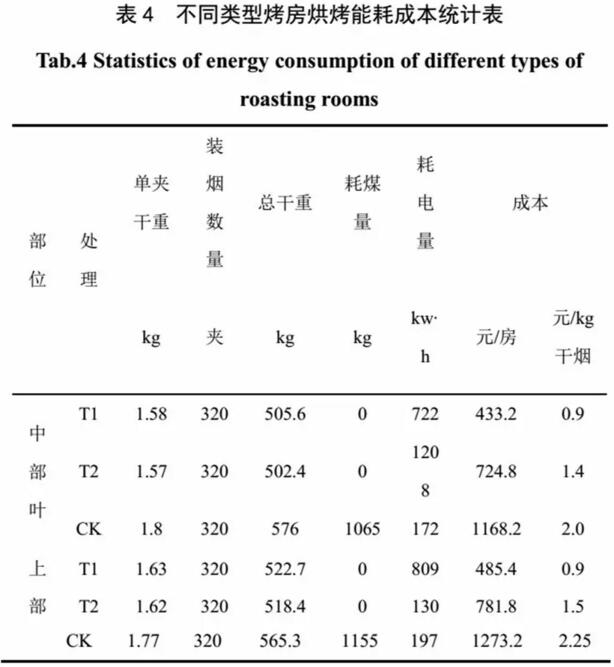 從表4可知,各處理烘烤能耗成本相比,T1能耗成本最低,中部葉和上部葉每千克干煙的成本均為0.9元;對照CK能耗成本最高,由煤和電兩種能源構(gòu)成,中部葉和上部葉每千克干煙的成本分別為2.0元和2.25元;T2能耗成本居中,中部葉和上部葉每千克干煙的成本分別為1.4元和1.5元。以上結(jié)果表明,T1處理的烤房具有明顯的節(jié)能效果,比對照CK烤房可節(jié)省1.1-1.35元/kg干煙。