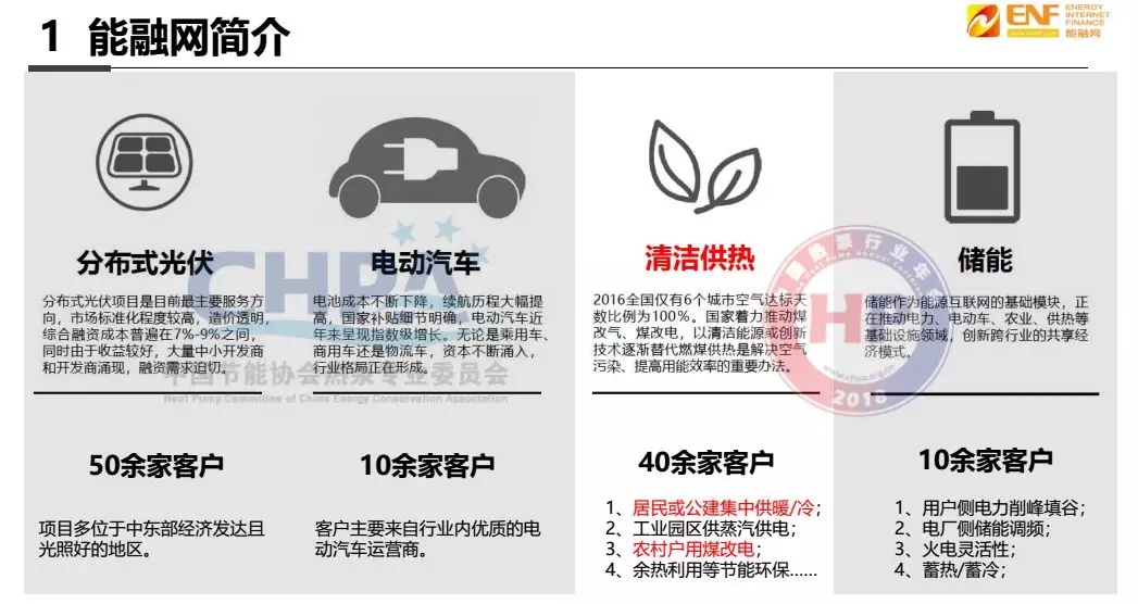 能融網(wǎng)是一個專門針對綠色能源的投融資服務(wù)平臺,服務(wù)范圍包含分布式光伏、電動汽車、清潔供熱、儲能四大領(lǐng)域。自2017年初,我們開始關(guān)注清潔供熱領(lǐng)域,主要分為工業(yè)供熱和居民供熱兩個方向。工業(yè)園區(qū)供熱是最早突破的領(lǐng)域,不過隨著近幾年來“煤改電”的發(fā)展,我們的重點開始轉(zhuǎn)向了居民供熱。