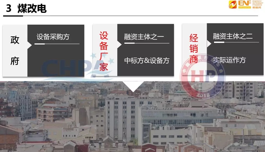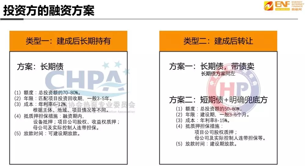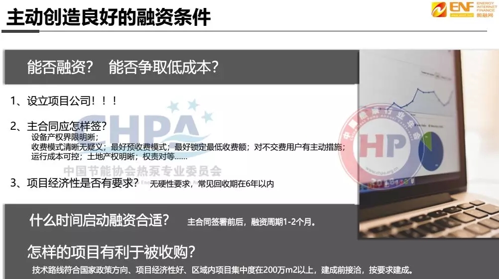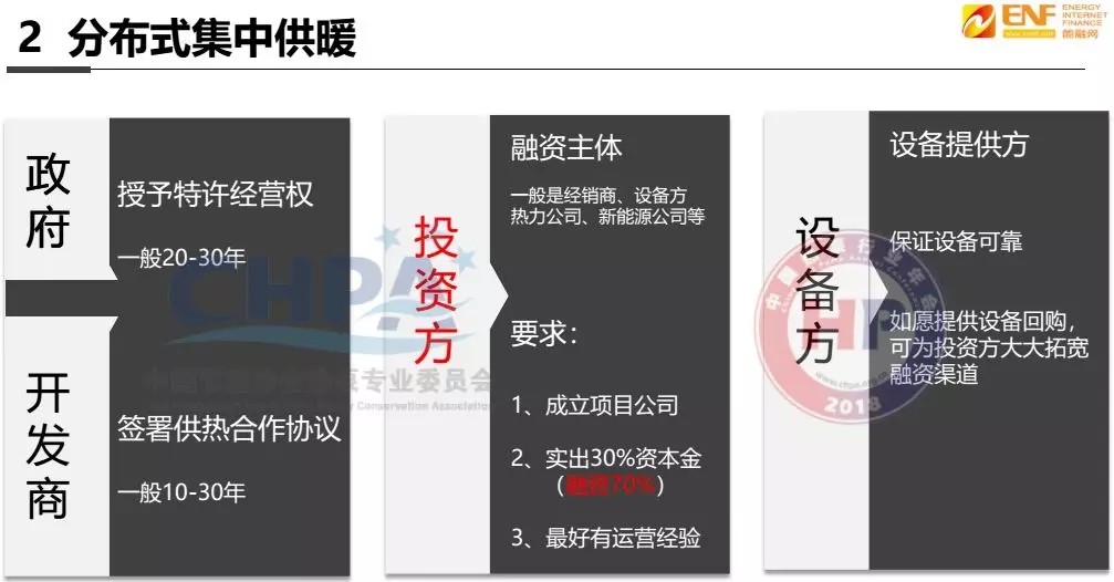 其次,我們還要看投資方,投資方到目前為止五花八門,一般有設(shè)備方、經(jīng)銷商、傳統(tǒng)的熱力公司、新能源公司等,主要對投資方的要求是要有項目公司,要具備運營經(jīng)驗,并且要出30%的保證金。