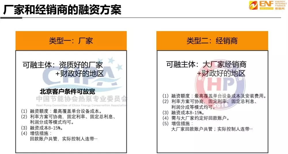 農(nóng)村“煤改電”除北京以外,對其他地方的政策看的不是很明白,簡單來說就跟其他BOT項目一樣,項目建成后,廠家沒有產(chǎn)權(quán)和收益權(quán),所以這一塊我們在做,但是做的并不多?扇谥黧w可以分為資質(zhì)好的廠家和大廠家的經(jīng)銷商兩類(財政好的地區(qū)),北京客戶條件可以放寬。