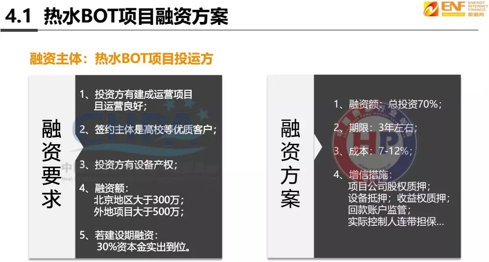 在熱水BOT方面,今年年初我們陸續(xù)接觸這樣的項目,只不過到目前為止沒有規(guī);捻椖堪>唧w融資要求是: