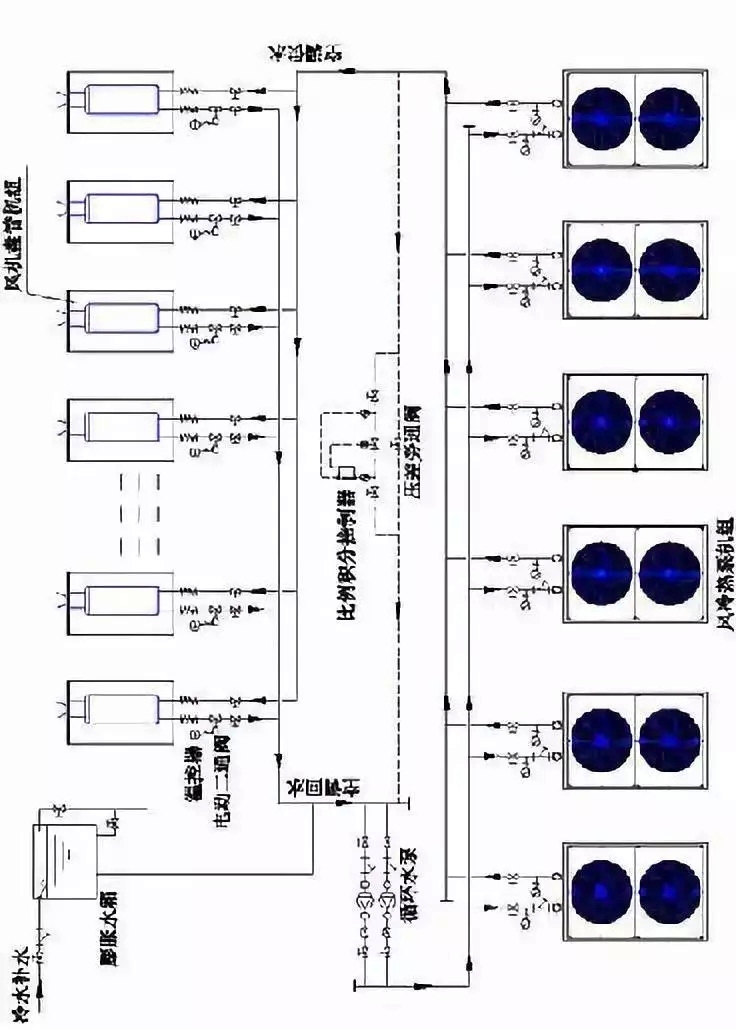 空調(diào)水系統(tǒng)為一次泵變流量、雙管制系統(tǒng),系統(tǒng)干管采用異程式。每層水系統(tǒng)的回水干管上設(shè)置平衡閥。每臺風(fēng)機(jī)盤管機(jī)組的回水管上設(shè)計(jì)電動二通閥。風(fēng)機(jī)盤管的供水量控制由室內(nèi)溫控器按所需的室溫來控制?照{(diào)冷熱水系統(tǒng)定壓補(bǔ)水裝置采用高位的膨脹水箱。
