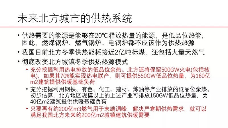 中國(guó)節(jié)能協(xié)會(huì)理事長(zhǎng)、中國(guó)工程院院士江億在中國(guó)節(jié)能協(xié)會(huì)舉辦的“2018中國(guó)節(jié)能與低碳發(fā)展論壇”上強(qiáng)調(diào),中國(guó)“缺油少氣”的資源狀況使我們很難按照西方的路徑煤改油氣,我國(guó)必須發(fā)展可再生能源與核能為主的能源供給系統(tǒng),與發(fā)達(dá)國(guó)家同步。在未來(lái)北方城市的供熱系統(tǒng)中,供熱需要的能源是能夠在20℃釋放熱量的能源,是低品位熱能,因此,燃煤鍋爐、燃?xì)忮仩t、電鍋爐都不應(yīng)該作為供熱熱源。
