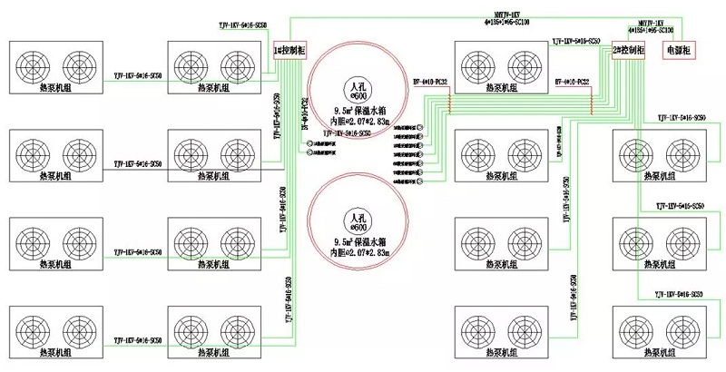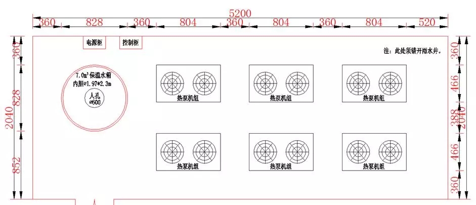 系統(tǒng)三占地面積8m×6.5m,共52m2,共布置4臺(tái)機(jī)組和1個(gè)5.0m3的保溫水箱,機(jī)組總制熱量為382kW,分別承擔(dān)8、10號(hào)樓的供熱負(fù)荷。如下圖。