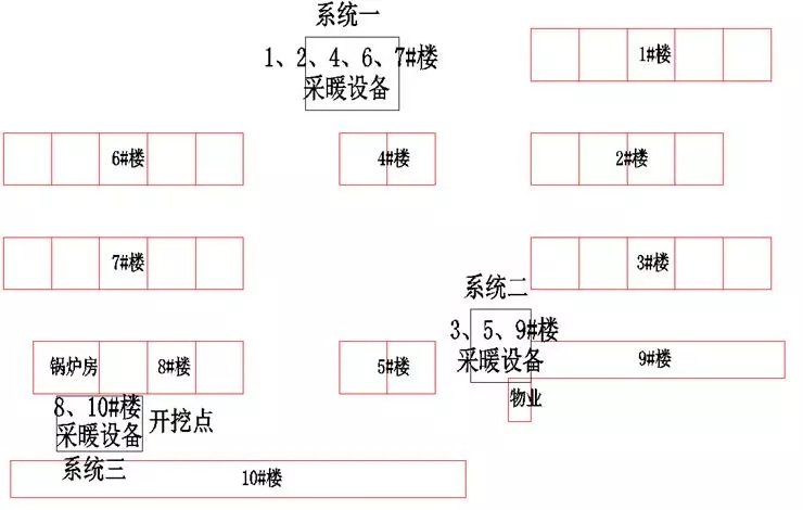 這個(gè)案例在陜西,一共有10棟住宅和物業(yè)管理,1~8號(hào)樓為6層,9~10號(hào)樓是1~2層,采暖面積一共42900多平,原先在8號(hào)樓東南角有一個(gè)燃煤鍋爐房。下圖是鍋爐房原先的管網(wǎng)布置,供暖系統(tǒng)由鍋爐房循環(huán)泵經(jīng)室外管網(wǎng)分別送到各棟樓室內(nèi)的采暖系統(tǒng)。