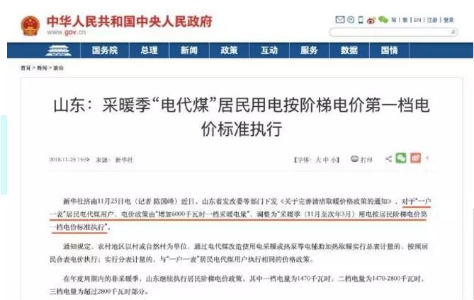 山東發(fā)改委發(fā)布了《關(guān)于完善清潔取暖價格政策的通知》,明確“一戶一表”居民電代煤用戶,采暖季(11月至次年3月)用電按居民階梯電價第一檔電價標(biāo)準(zhǔn)執(zhí)行。工商業(yè)的電代煤項目、居民住宅小區(qū)內(nèi)采用空氣源熱泵電鍋爐等電采暖電輔助加熱取暖項目,按照“清潔取暖用電市場化競價采購”政策執(zhí)行。